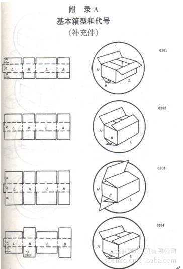 基礎(chǔ)型即基本箱型,在標(biāo)準(zhǔn)中有圖例可查,一般用四位數(shù)字表示,前兩位表示箱型種類,後兩位表示同一箱型種類中不同的紙箱式樣。例如:02表示開槽型紙箱;03表示套合型紙箱等。而組合型是基礎(chǔ)型的組合,即由兩種以上的基本箱型所組成,用多組四位數(shù)字或代號(hào)來表示。例如,一個(gè)紙箱的上搖蓋可以用0204型,下?lián)u蓋用0215型。